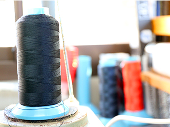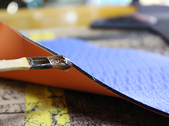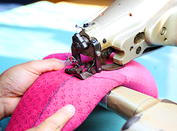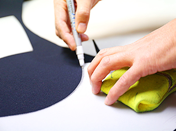 製造工程はみごとな職人技が繰り広げられます。作業台に広げられた『素材』に型紙をのせて裁断。オリジナルの型紙ひとつひとつにも歴史の中で探求されてきたカーブが生まれています。ひとつのウェットスーツに20以上のパーツがひとの手によって切り取られ、パーツを接着するのも機械ではない丁寧な『手しごと』です。ミリ単位で段差が生まれるパーツも平らに接着していく技術には圧巻。縫い合わせも深さ(厚み)に応じた細かな調節を行い、ゴムとの調和を大切にした専用ミシンを自由にあやつるみごとな『すくい縫い』です。